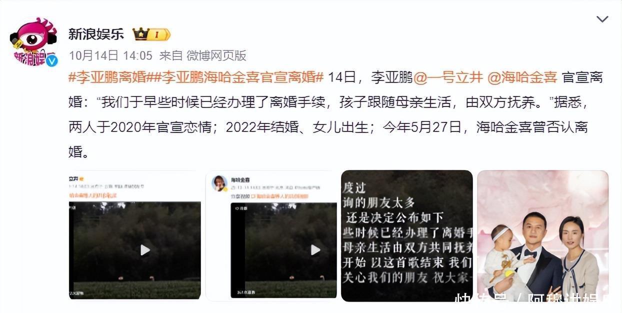 但是,这段安稳日子没持续多久就结束了。2025年初传来了夫妻俩离婚的消息,网友对此半信半疑。而海哈金喜也第一时间否认了这条传闻。但在10月14日,李亚鹏海哈金喜离婚被顶上了热搜榜首!